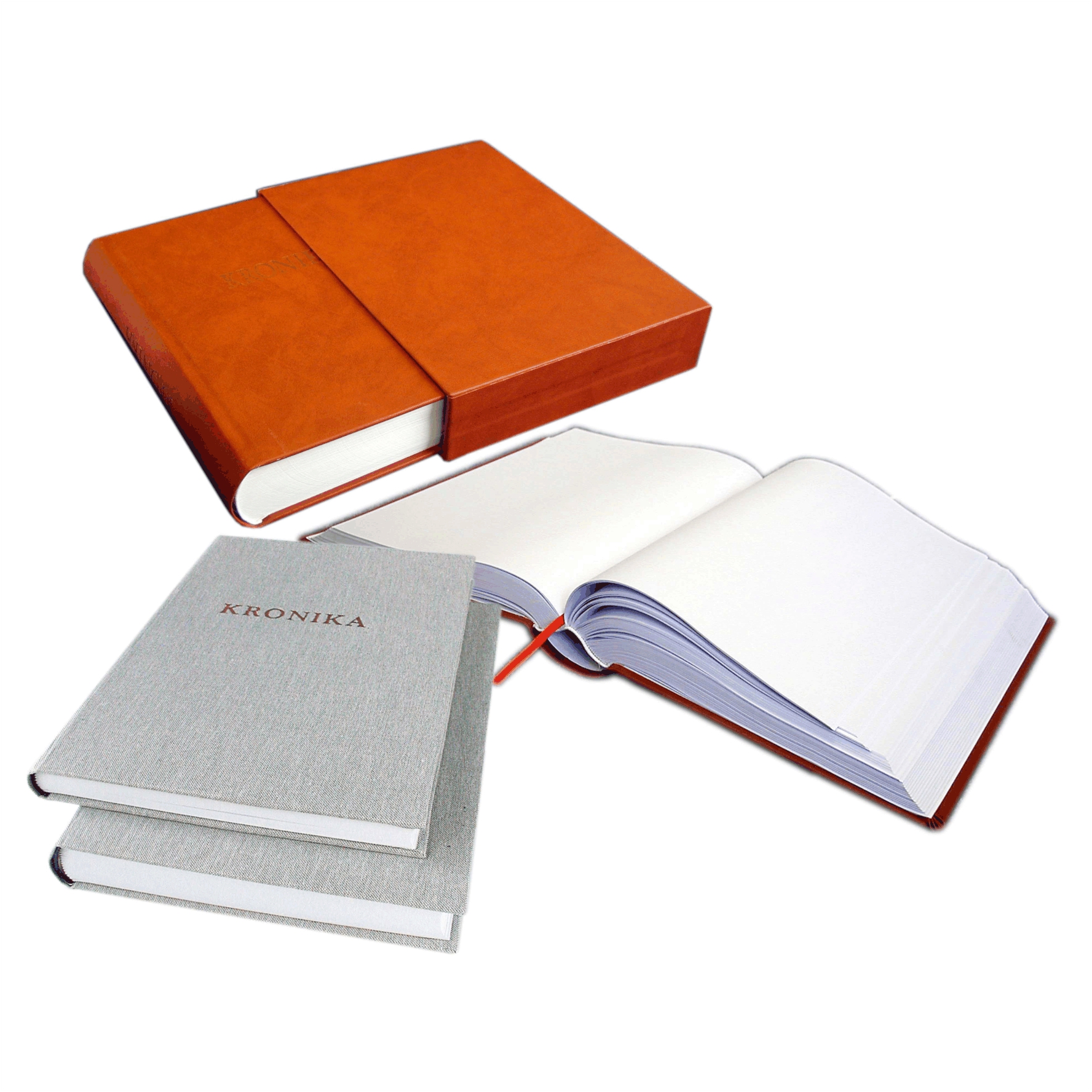 Kroniky mají potah z režného plátna nebo imitace kůže v různých odstínech. Nápis je proveden zlatou termoražbou. Listy o gramáži 110 jsou v šité vazbě. Kromě sériové výroby lze zhotovit na zakázku kronika jakéhokoliv formátu a popisu. Vícelistou kroniku lze opatřit pouzdrem.